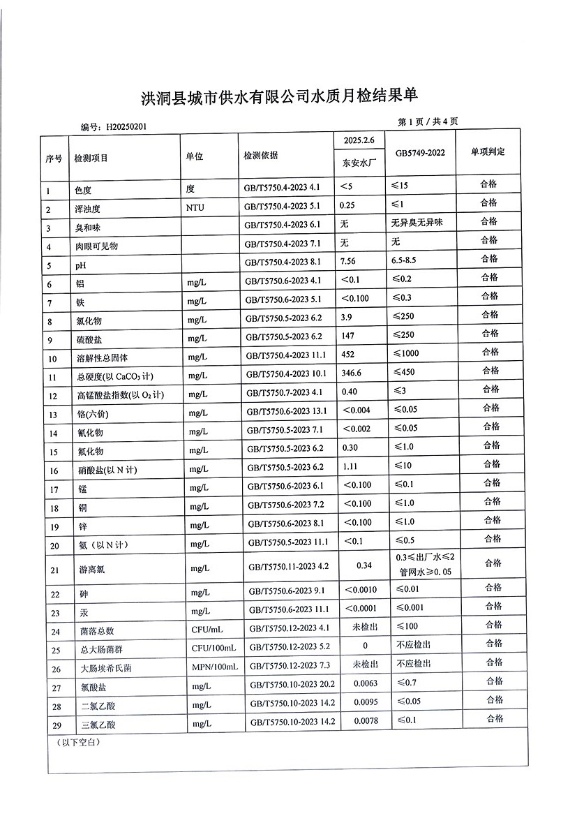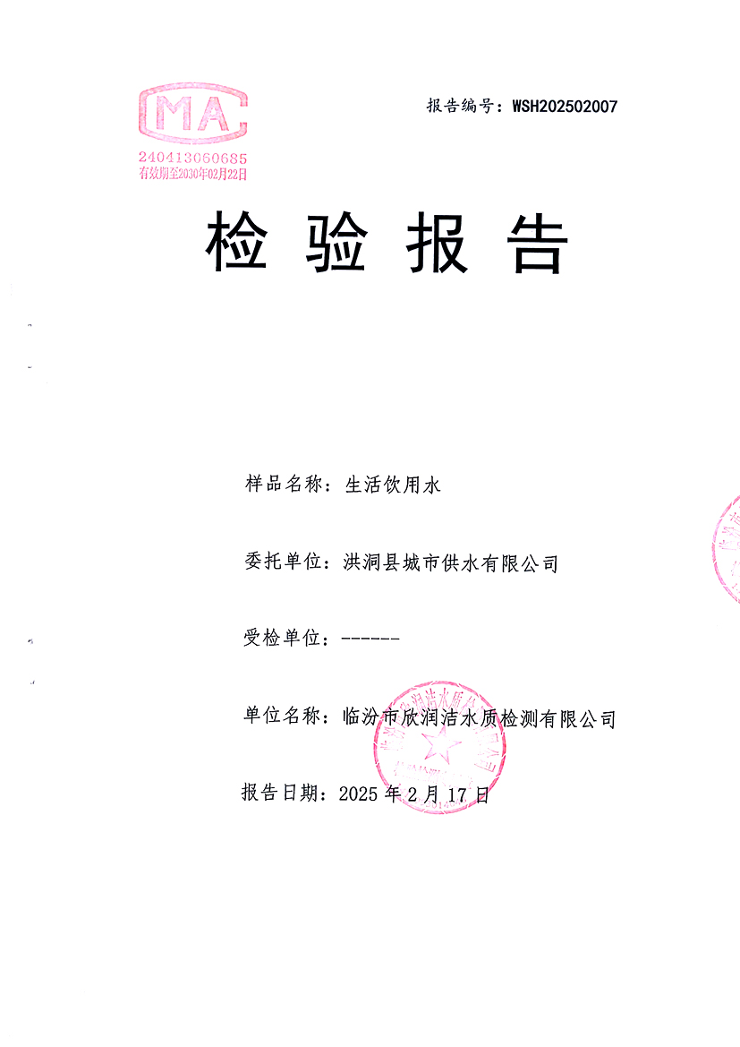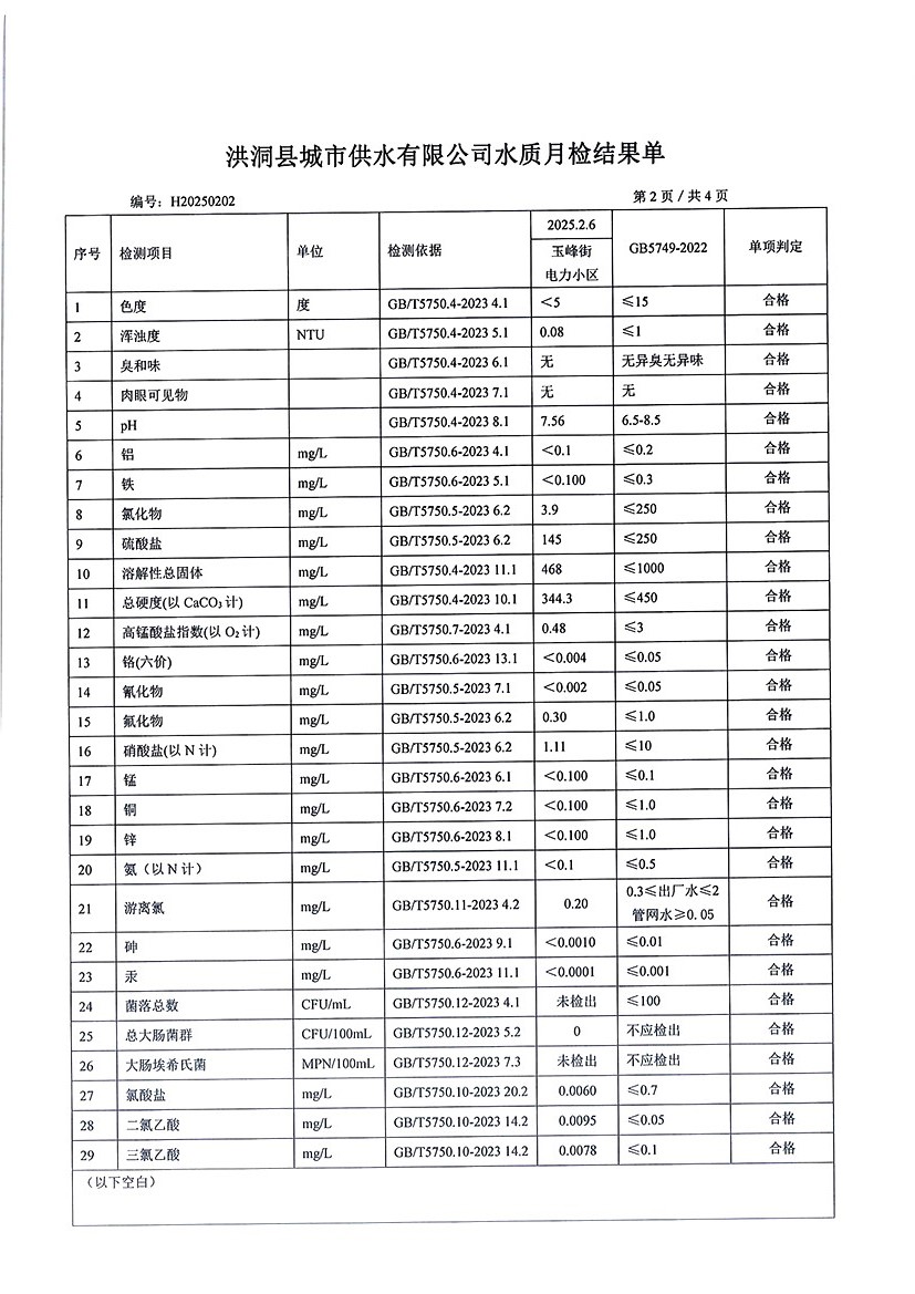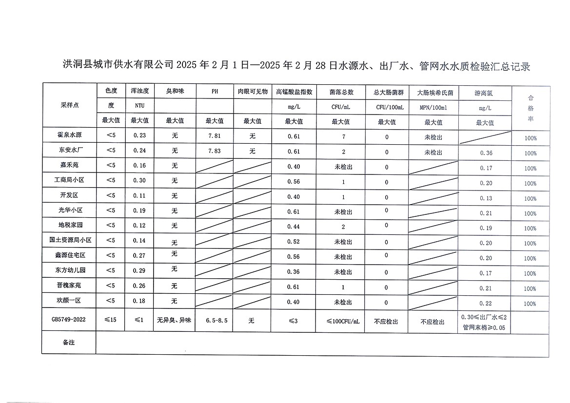 洪洞县城市供水有限公司2025年2月份水质检测报告