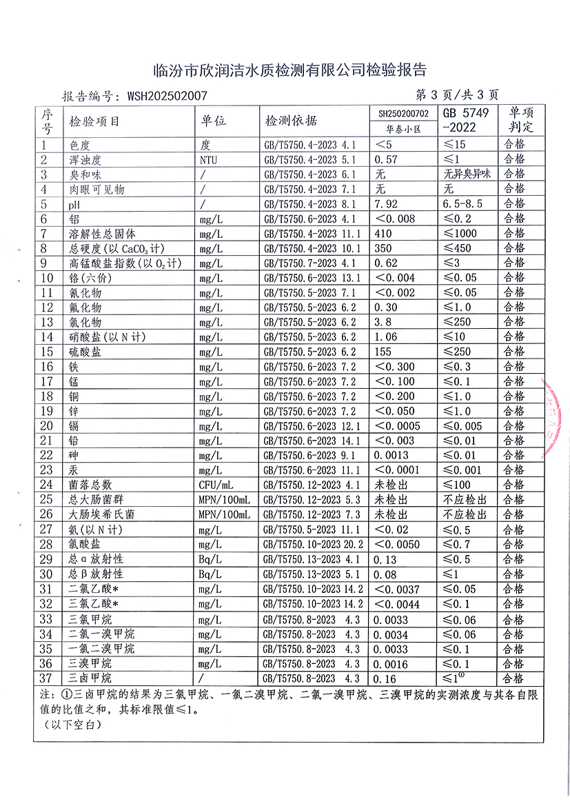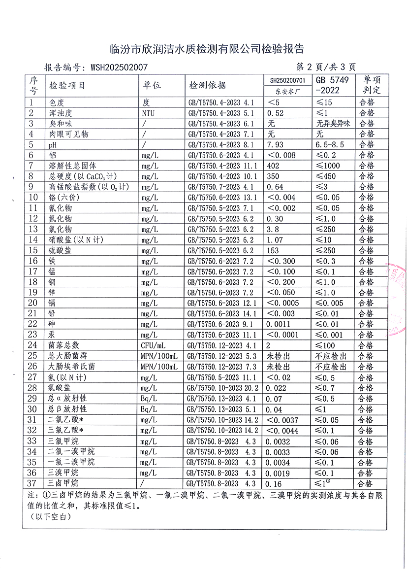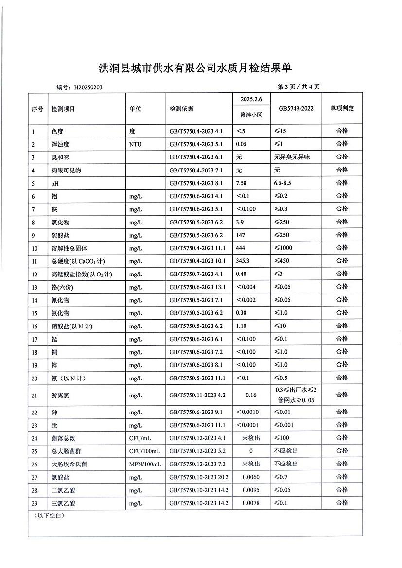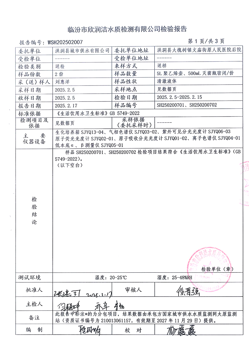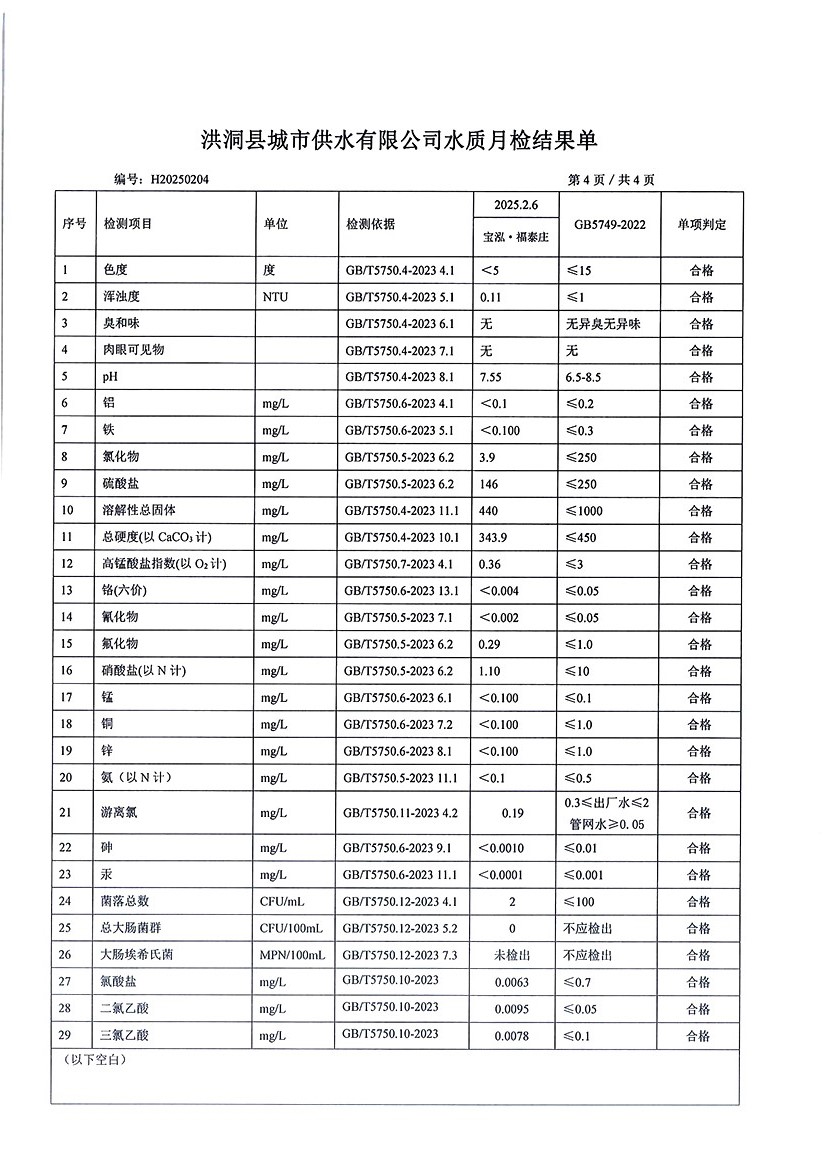 洪洞县城市供水有限公司2025年2月份水质检测报告