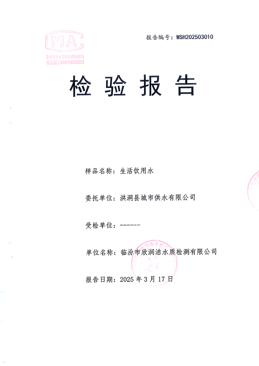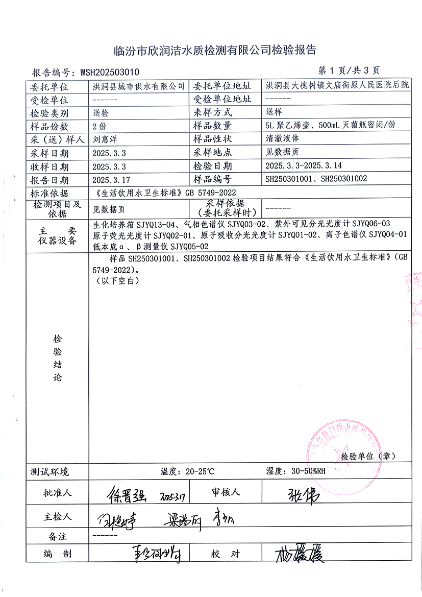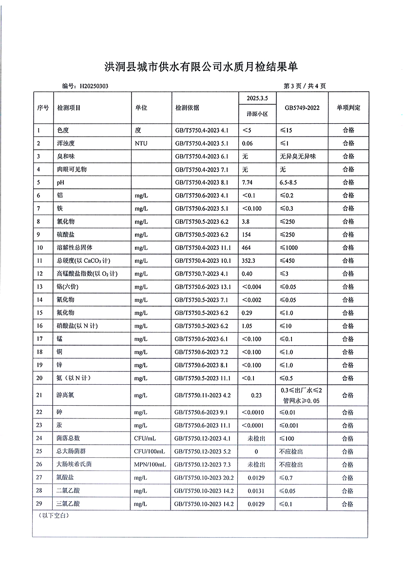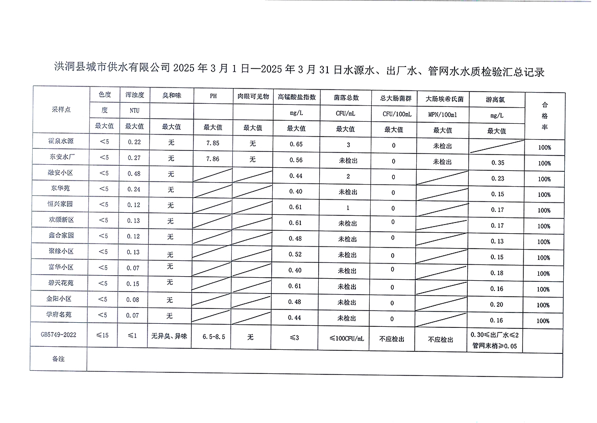 洪洞县城市供水有限公司2025年3月份水质检测报告