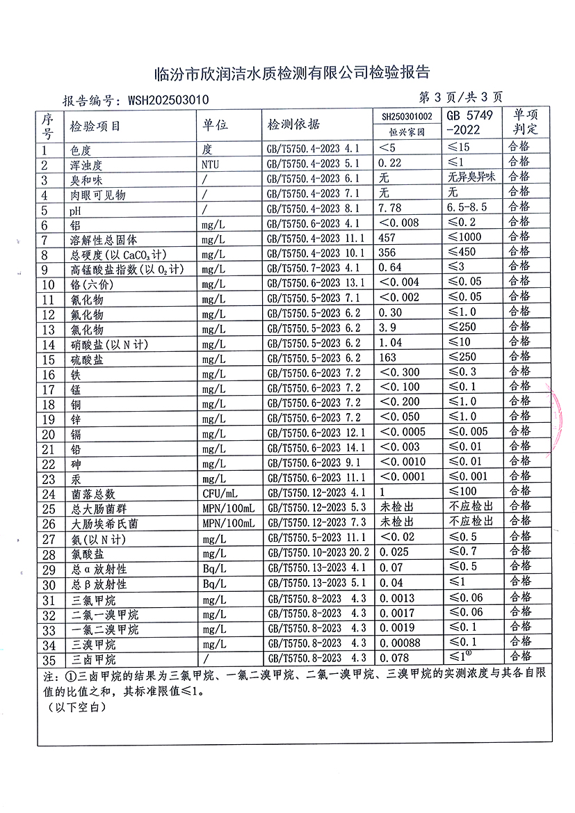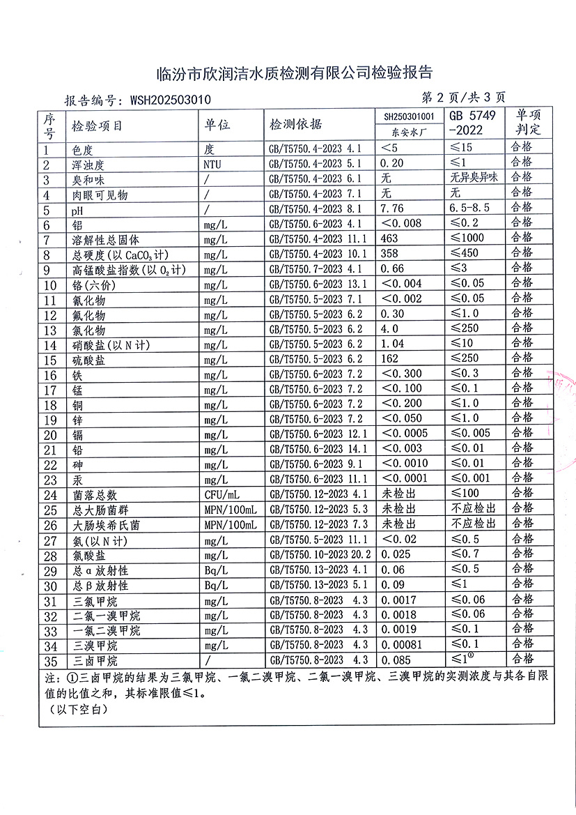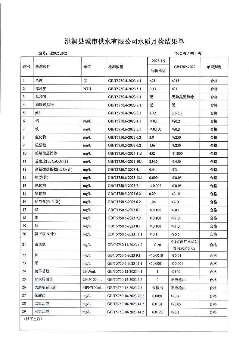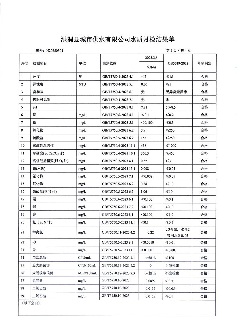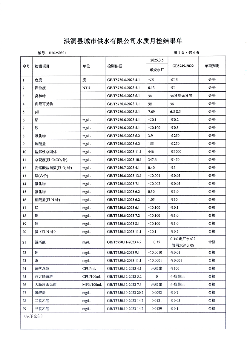 洪洞县城市供水有限公司2025年3月份水质检测报告