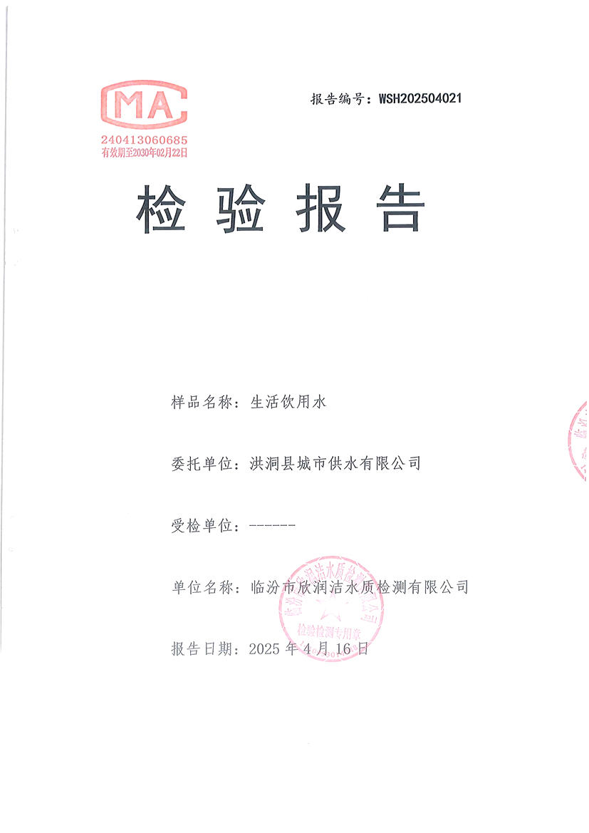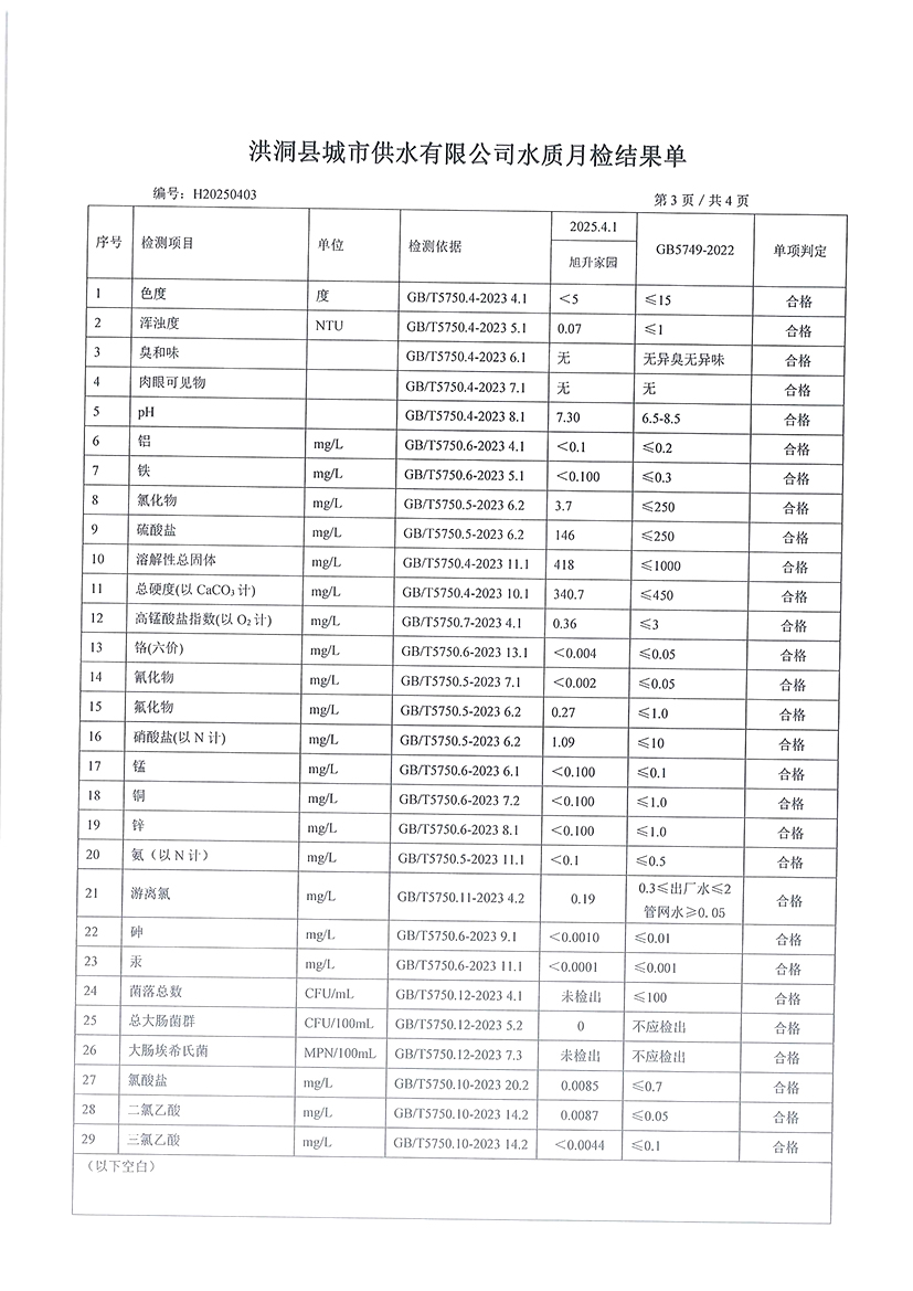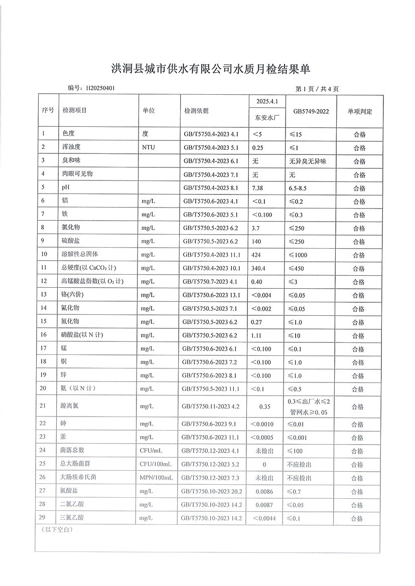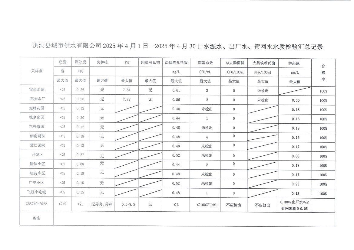 洪洞县城市供水有限公司2025年4月份水质检测报告