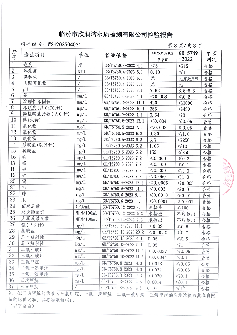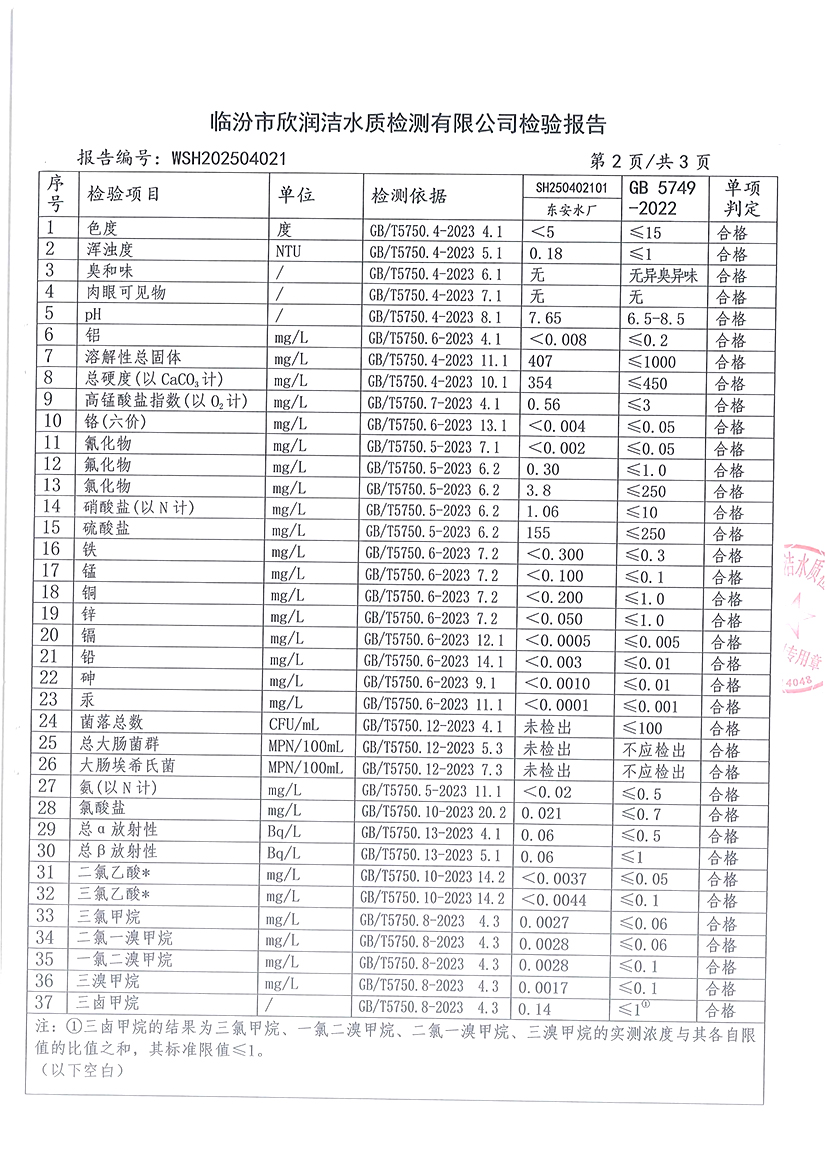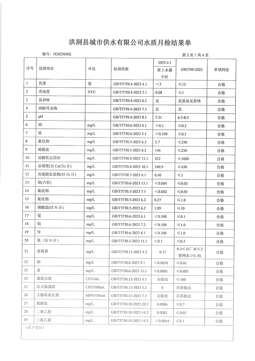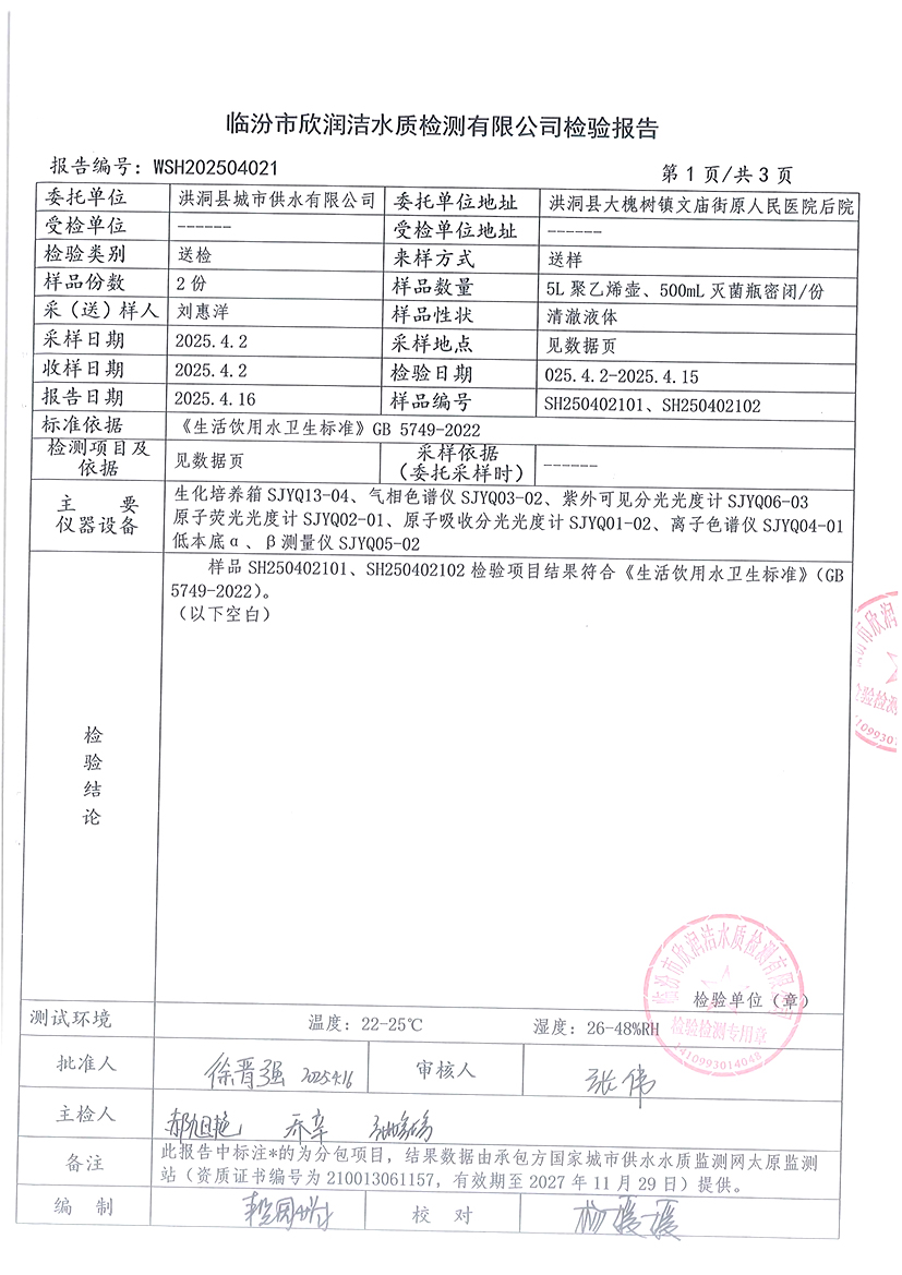 洪洞县城市供水有限公司2025年4月份水质检测报告