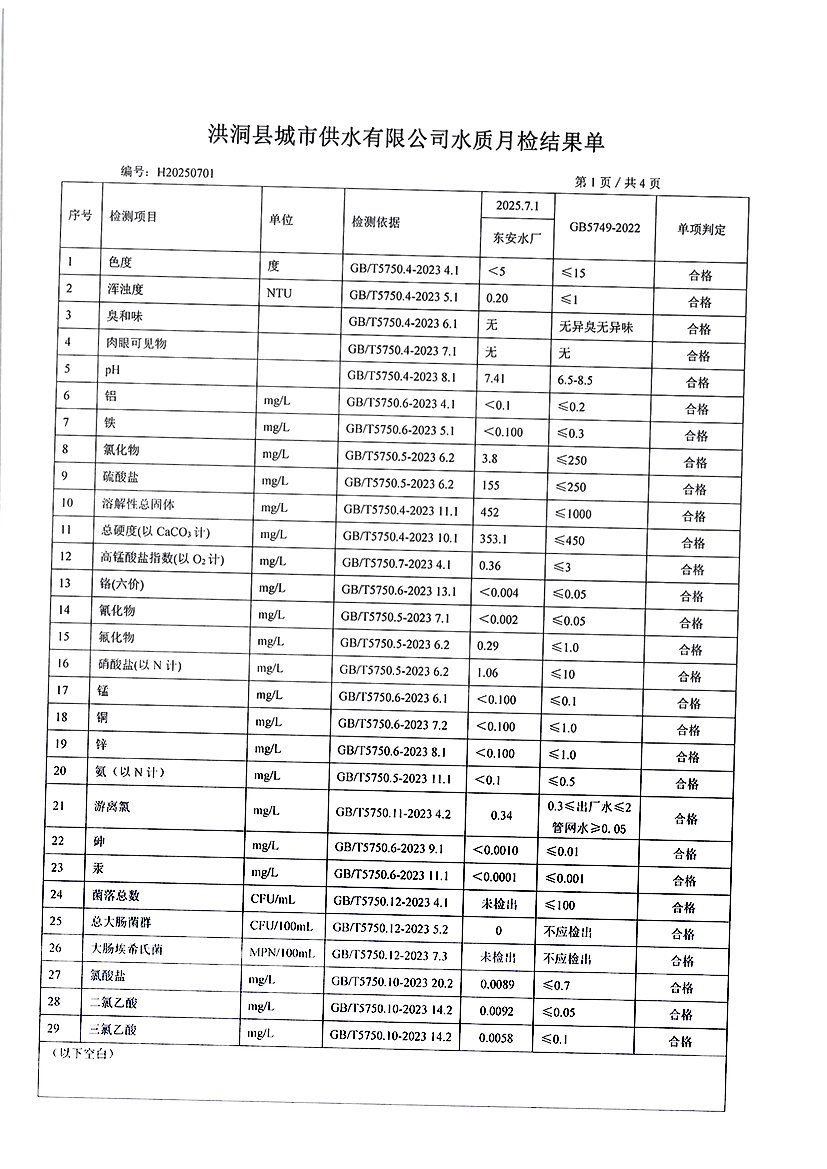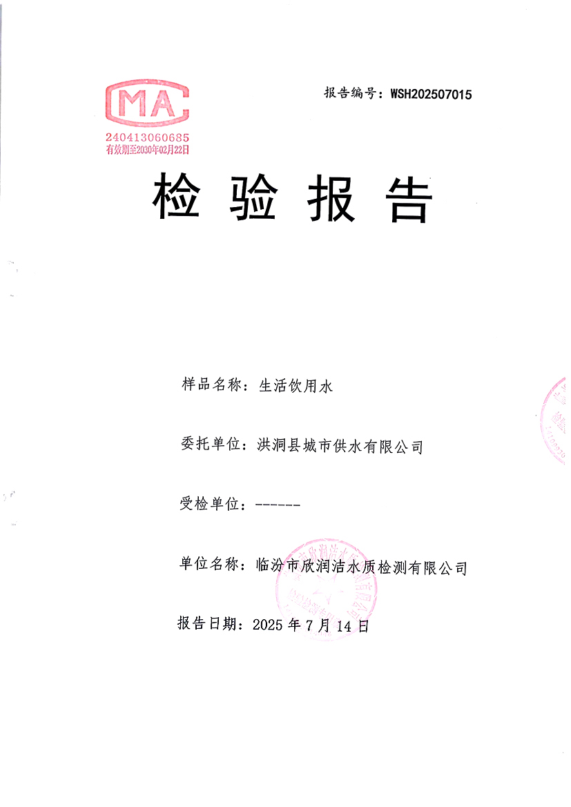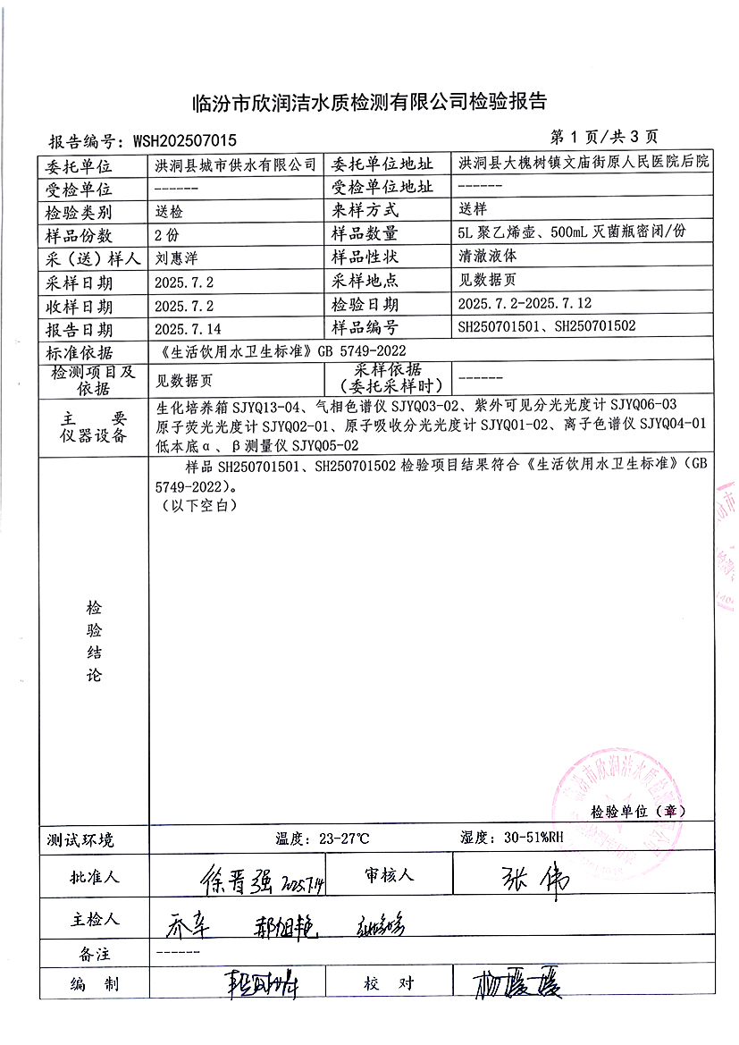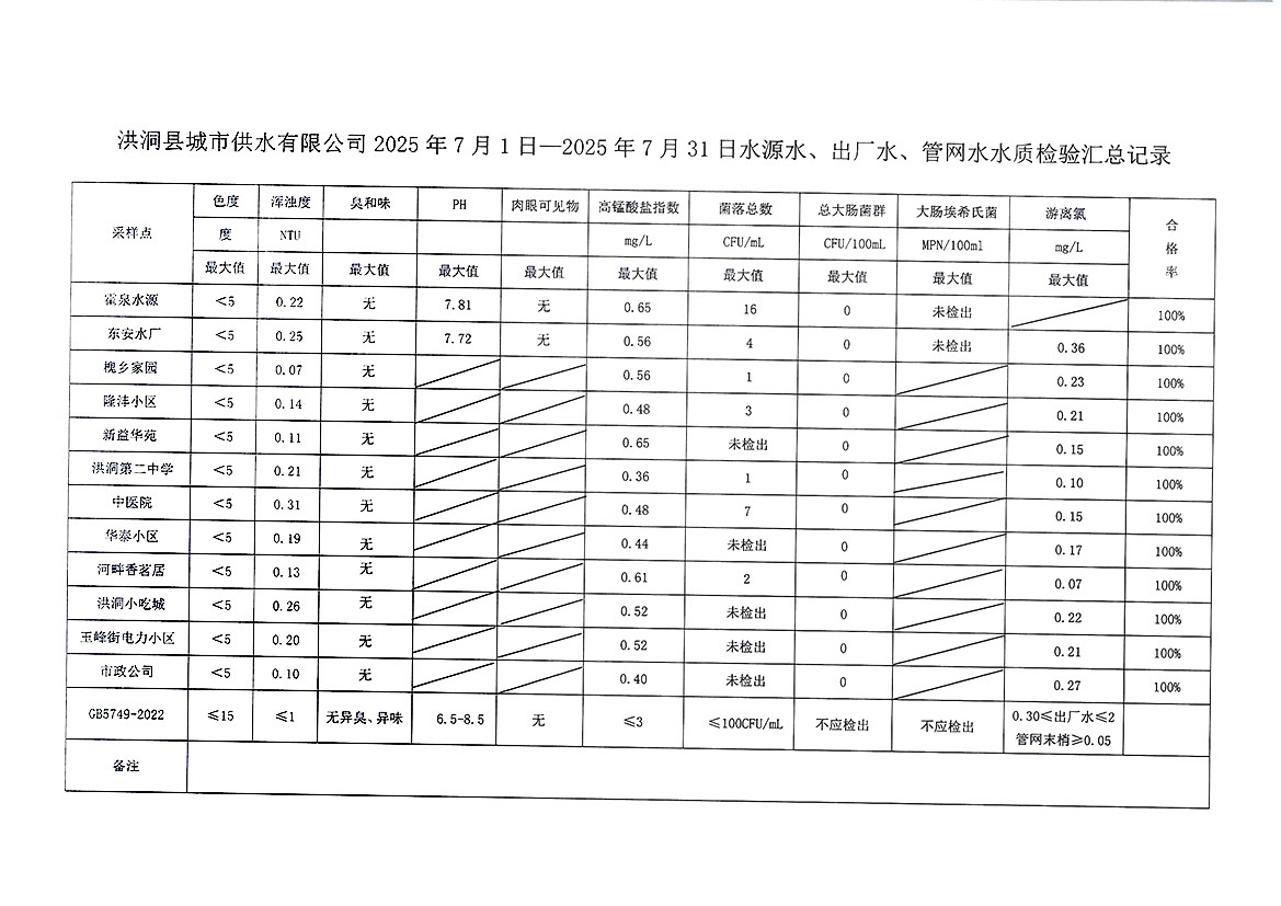 洪洞县城市供水有限公司2025年7月份水质检测报告