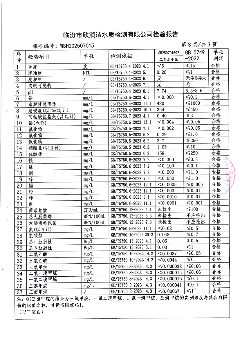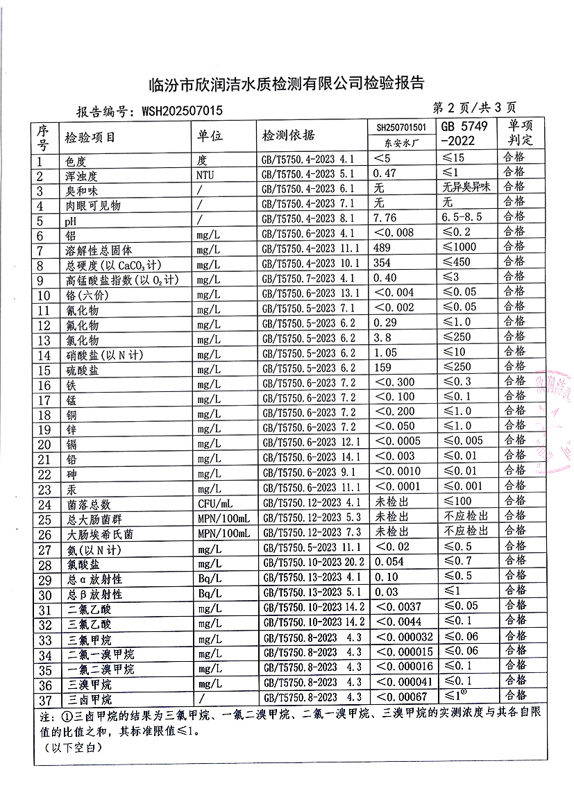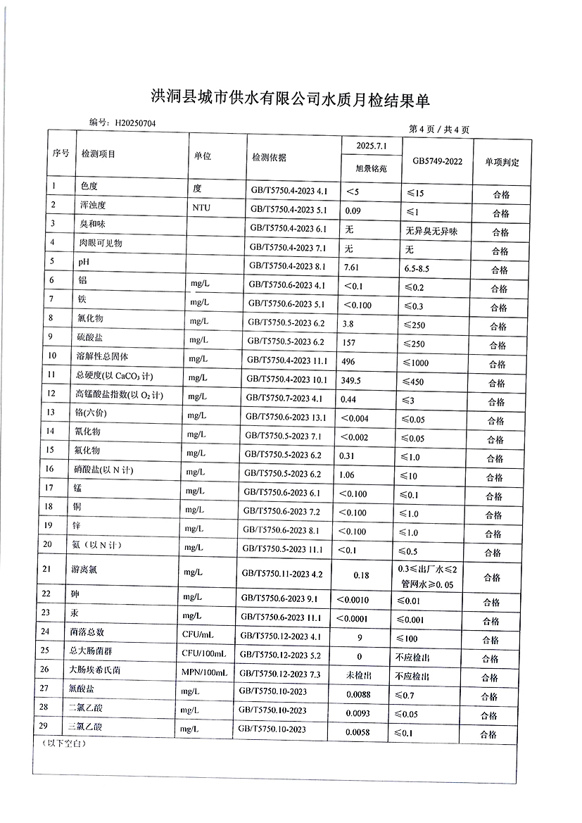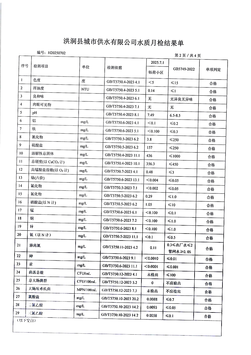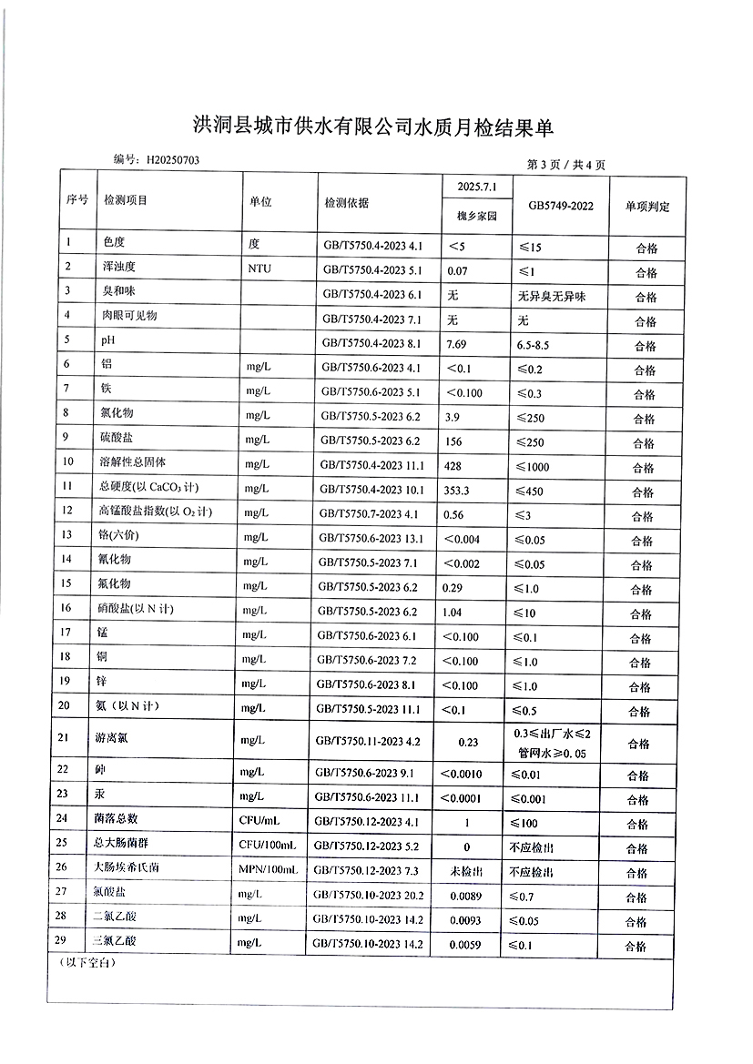 洪洞县城市供水有限公司2025年7月份水质检测报告