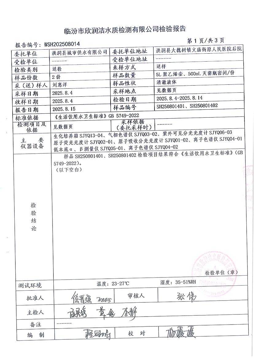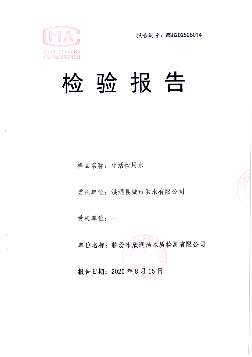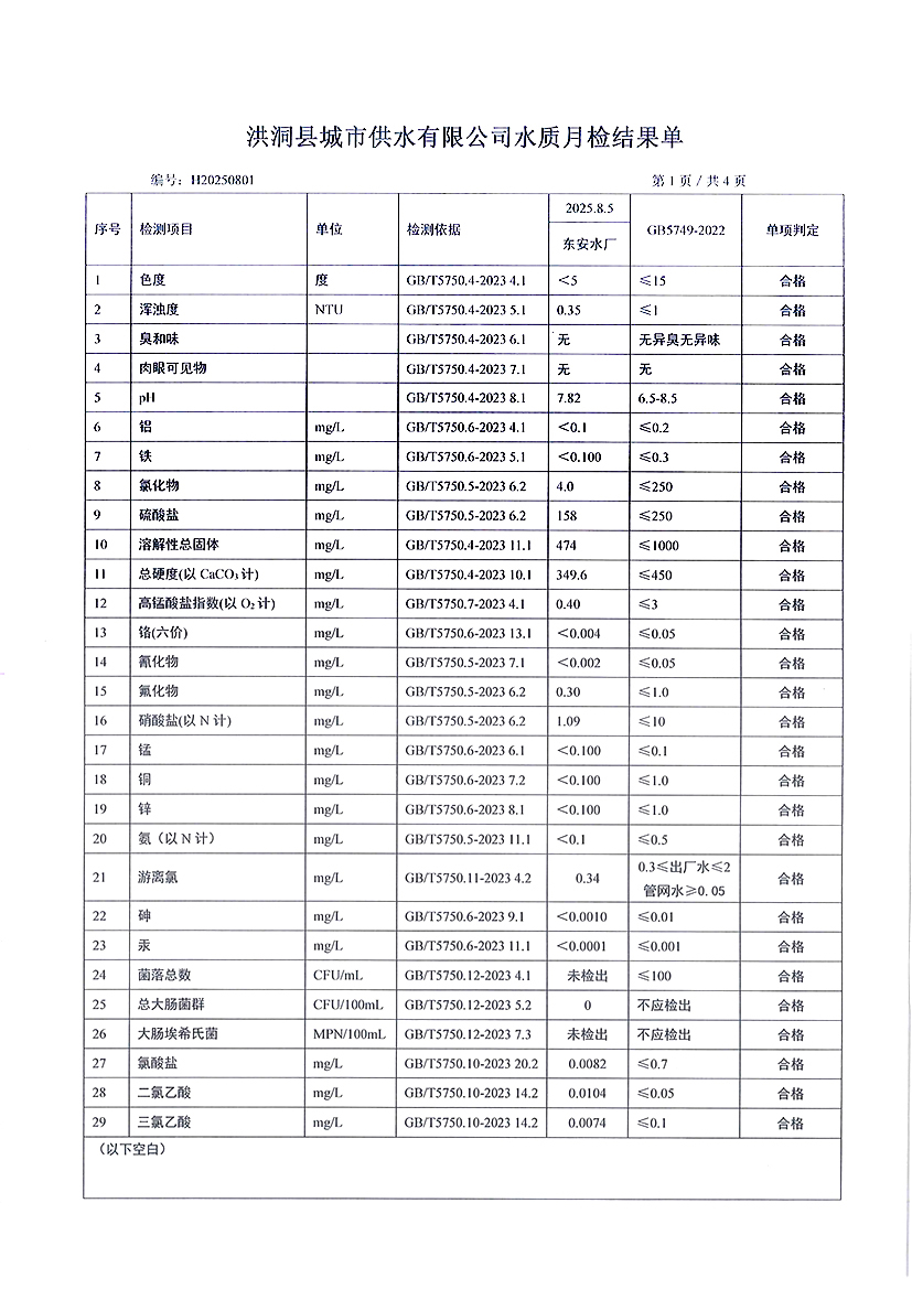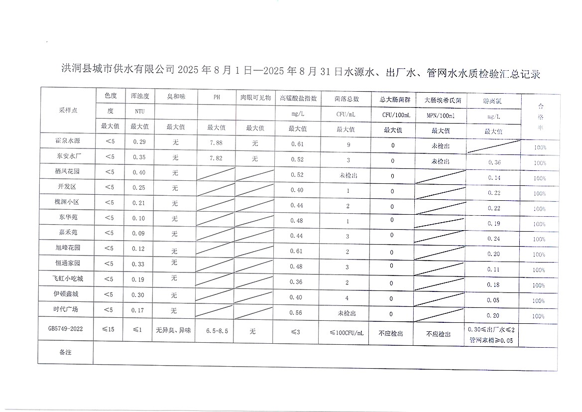 洪洞县城市供水有限公司2025年8月份水质检测报告