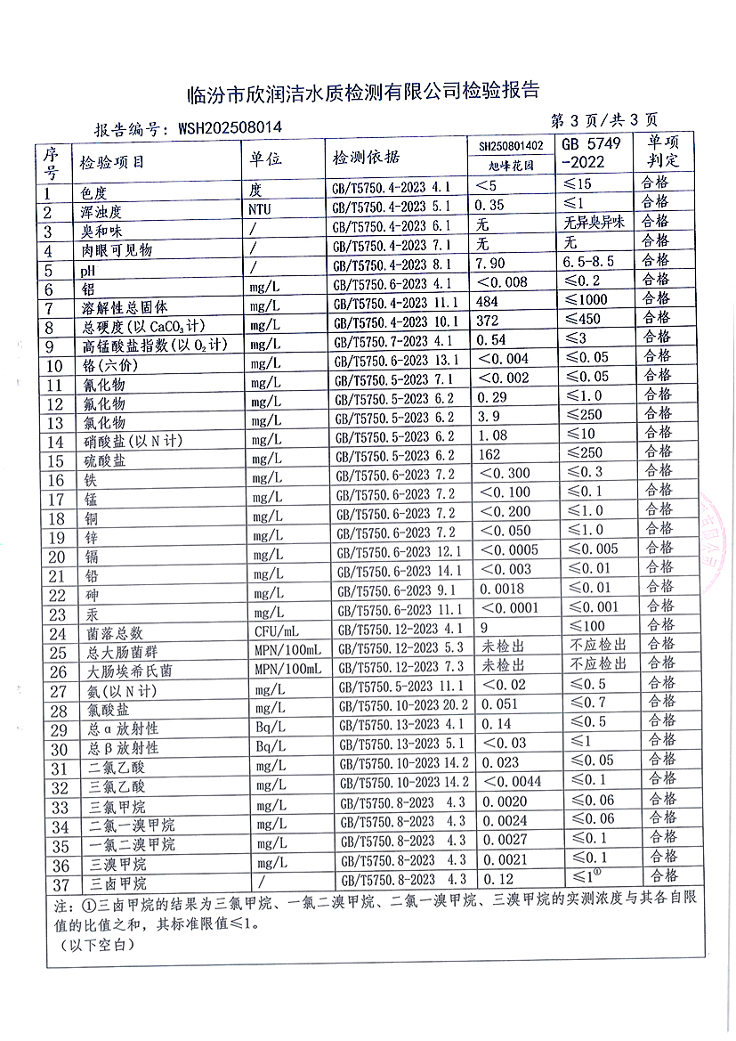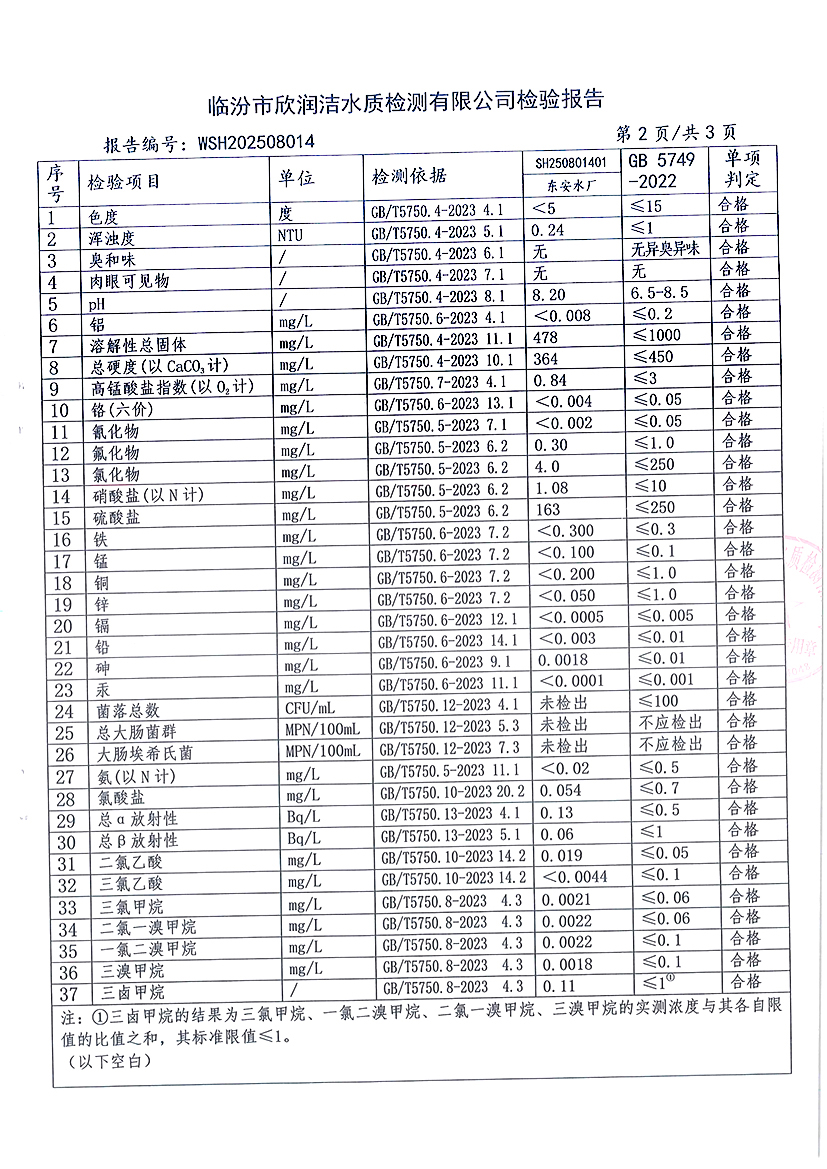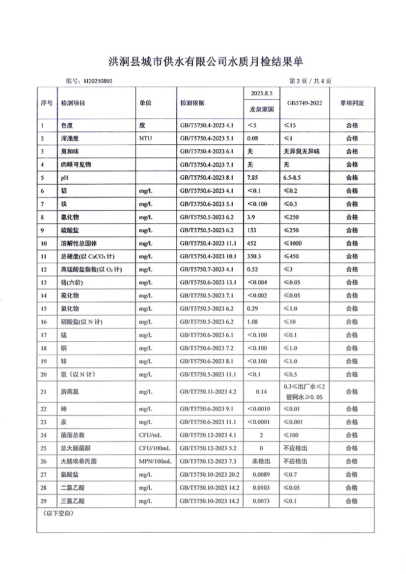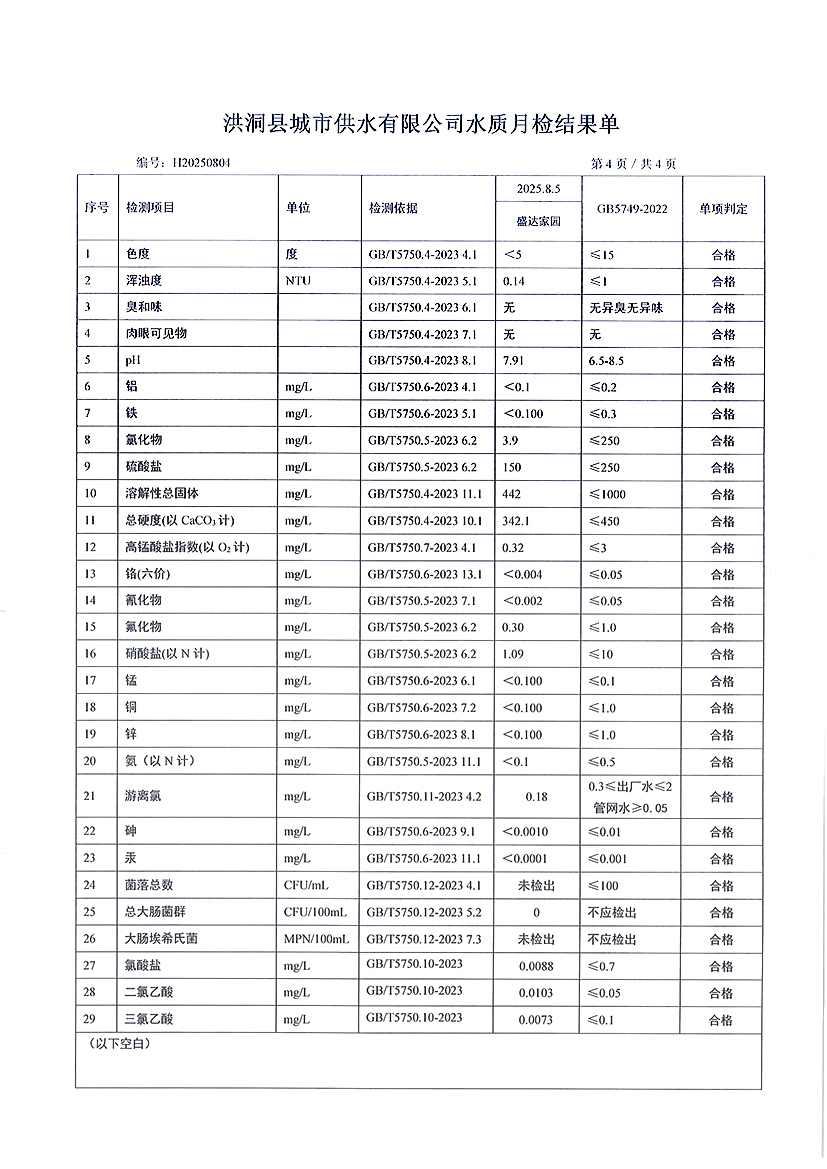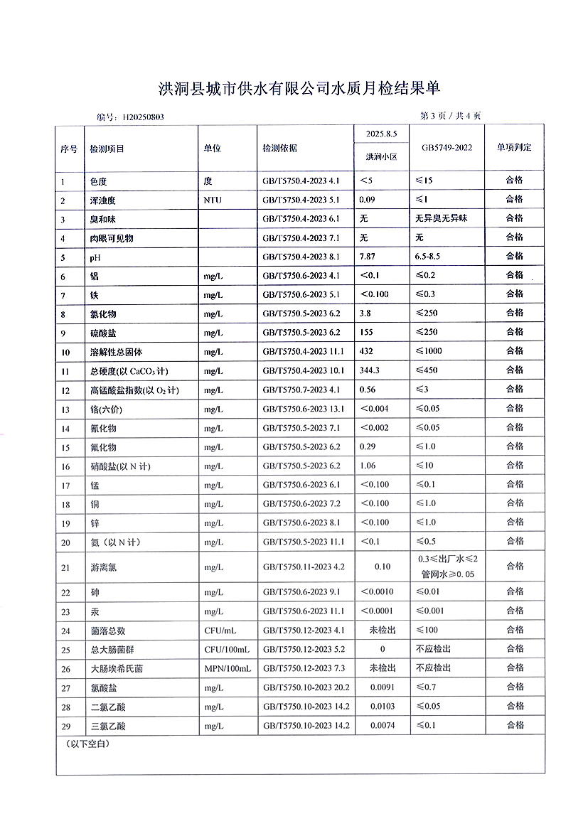 洪洞县城市供水有限公司2025年8月份水质检测报告